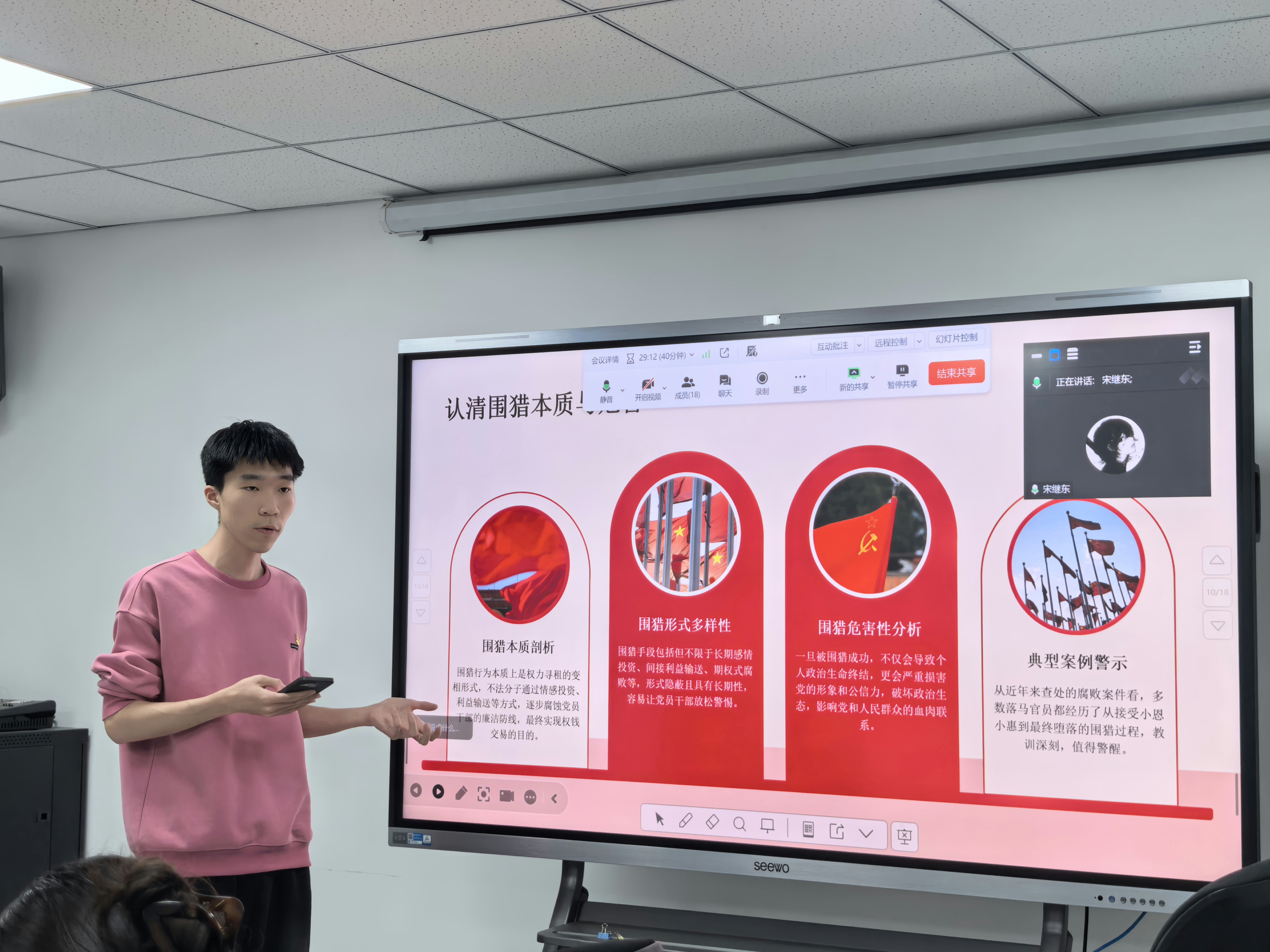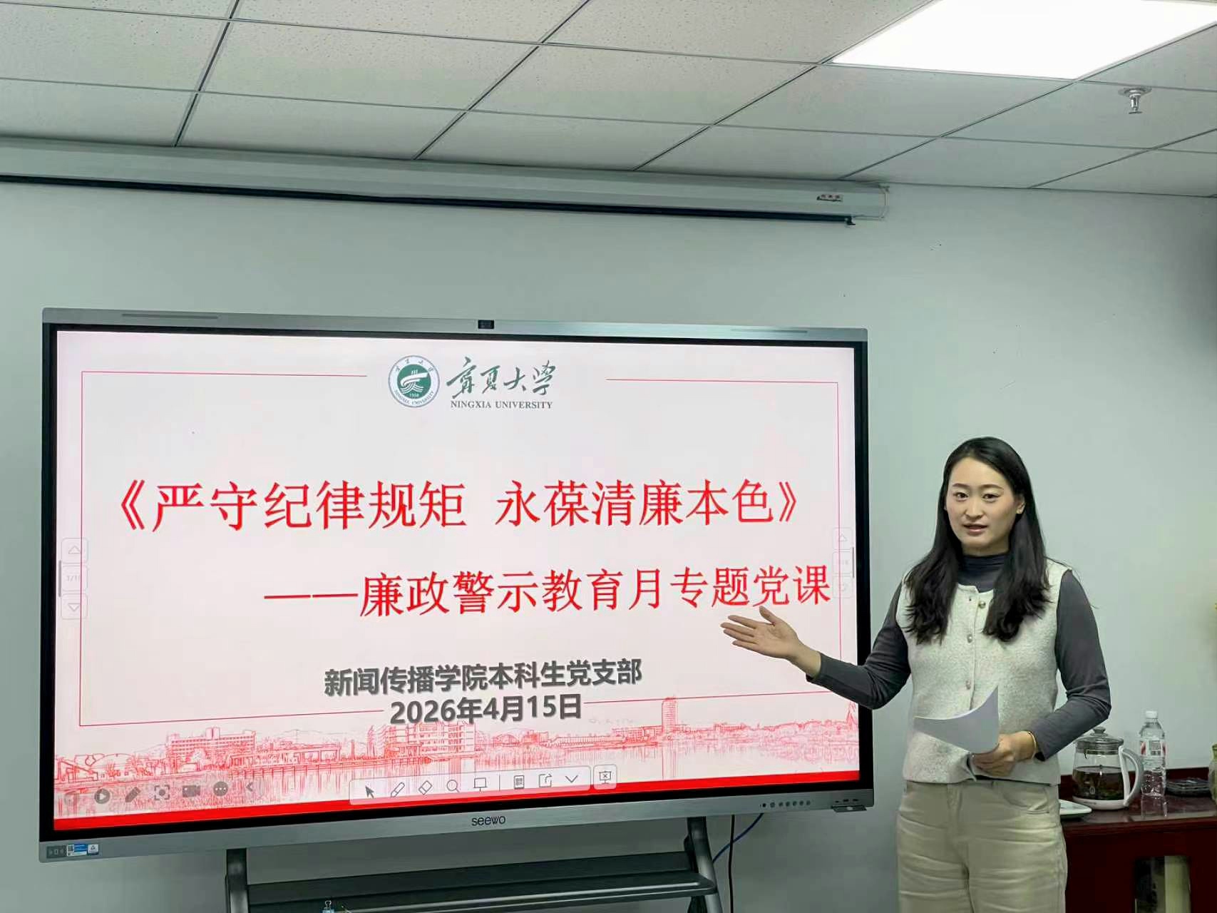 支部书记王亚莉、副书记杨文浩围绕“廉政警示教育月”工作安排带头讲党课。本次党课以“严守纪律规矩、永葆清廉本色”为主题,紧扣学生党员成长成才关键阶段,引导大家深学细悟党的纪律要求,筑牢拒腐防变思想防线 。通过案例剖析与纪律解读,帮助学生党员明确纪律底线、强化规矩意识,自觉做到慎初、慎微、慎独、慎友,扣好廉洁自律“第一粒扣子”,以忠诚干净担当的青年党员风貌,坚定理想信念、践行初心使命 。